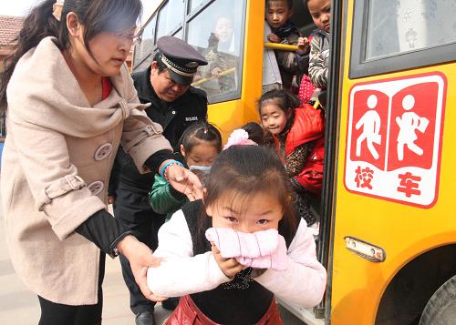 3月30日,山东省博兴县庞家派出所民警在教孩子们正确的逃生方法。当日,山东省滨州市博兴县庞家派出所组织民警来到辖区学校,对校车进行全面检查,并对师生进行安全乘车知识教育。新华社发(孙国栋 摄)