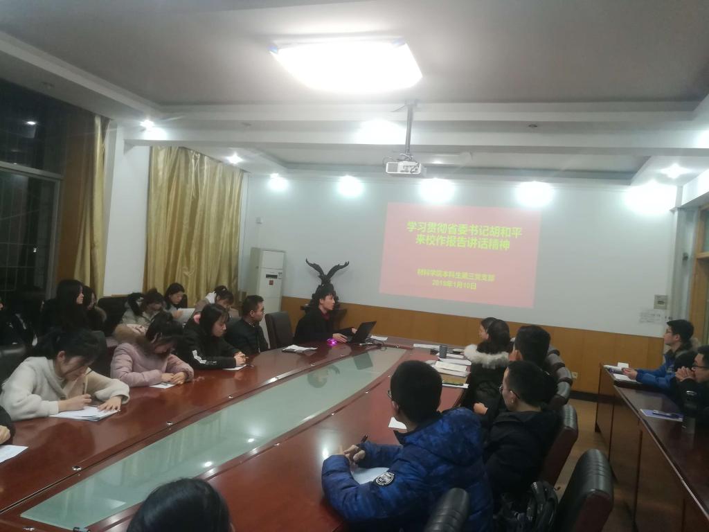 2019年1月7日至10日,材料学院学生党支部分别召开专题学习会,学习省委书记胡和平来校作报告讲话精神。会议由各党支部书记主持,全体学生党员、入党积极分子参加。