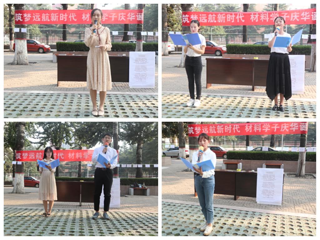 刘宝瑞同志首先以“我和我的祖国”为题进行了演讲,赞颂了新中国成立以来创造的一个又一个“中国奇迹”。红色政权来之不易,新中国来之不易,中国特色社会主义来之不易,只有坚持中国共产党的领导,我们才能让“幸福之花”遍布神州大地。随后,褚陆嘉、韦媛同志以“梦想照亮中国”为题,朗诵赞美了中华儿女锲而不舍追求梦想的伟大精神。麻一荻、杨琳娜同志以“祖国在我心中”进行了演讲,通过深情的话语回首七十载峥嵘岁月,表达了对祖国取得辉煌成就的自豪感。活动气氛在歌曲《我和我的祖国》中推向高潮,全体师生高举五星红旗合唱,用嘹亮的歌声为祖国庆生。