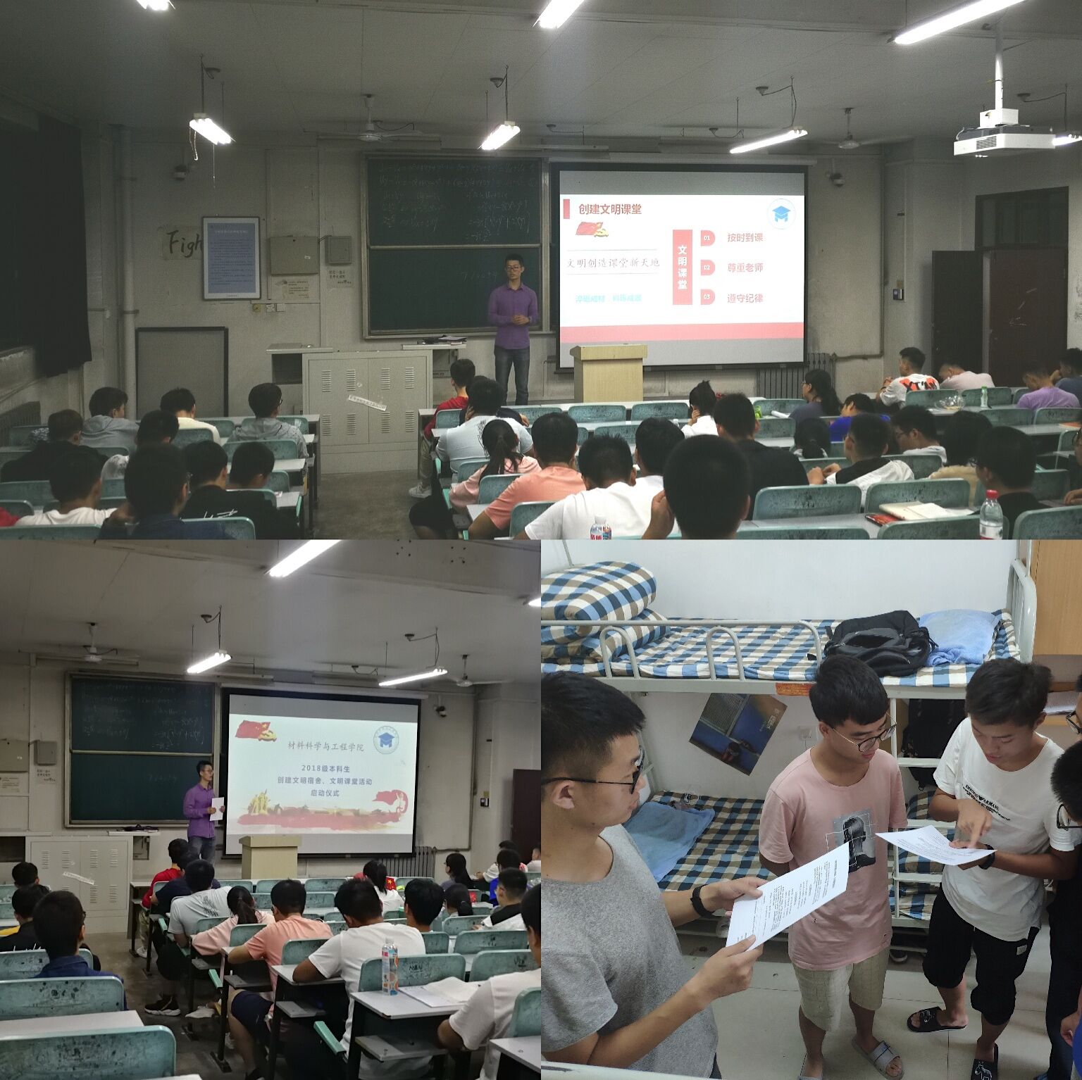 九月中旬,学院召开专题工作会议,对创建文明宿舍、文明课堂活动进行了安排部署,通过实地调查、意见征询、主题班会等方式,充分检视问题、查摆不足,对宿舍和课堂中出现的普遍不文明行为进行了归类总结,进一步明确了整改任务和工作目标。学院利用新媒体传播快、内容新、影响深等特点,首先在学院微信公众平台发起了《材料学院创建文明宿舍、文明课堂》的倡议,内容围绕“文明宿舍引领新风尚”和“文明创造课堂新天地”两大主题对全院学生提出了“六要”要求,号召同学们在新学期展现全新精神面貌,营造优质宿舍环境和学习氛围。其次,各年级辅导员根据实际分别组织开展年级会、专业会、主题班会等活动,进一步推动倡议宣传,同时,各年级辅导员定期深入学生宿舍,对学生宿舍用电、卫生等方面整改情况进行全面检查,针对性深入学生课堂,以点名、听课等形式对课堂纪律情况进行严格抽查,对宿舍和课堂中出现的突出问题形成问题清单和整改清单,明确整改责任和整改时限,责令有关人员、宿舍即时整改,深刻检讨。在此基础上,及时有效组织开展主题班会、座谈会等活动,对宿舍检查情况和课堂抽查情况进行通报,对宿舍安全隐患,宿舍、课堂不文明现象等进行列举反思、纠错改正,并充分听取师生意见,积极引导学生践行文明、做文明人。