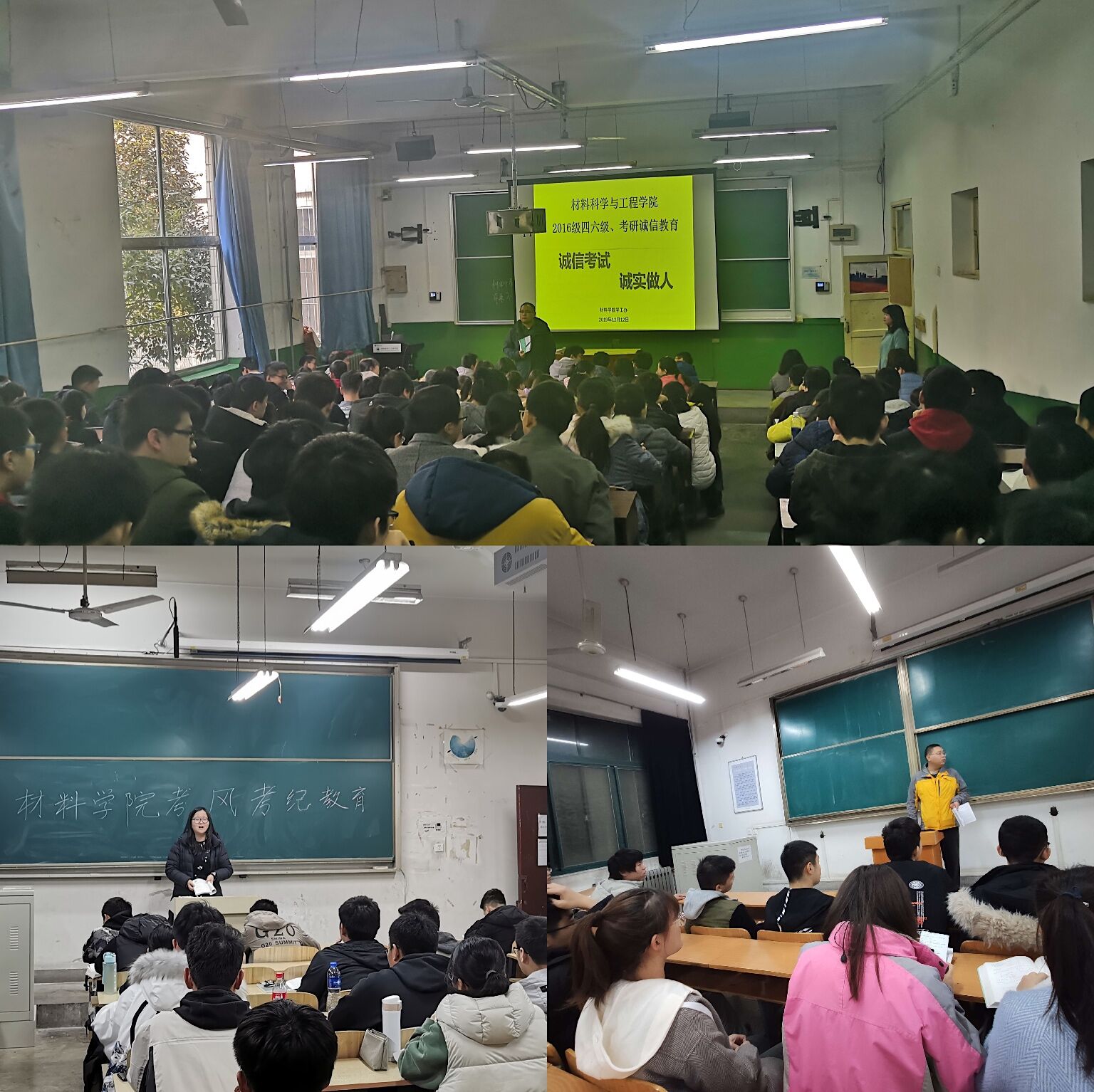 根据学校近期安全稳定工作相关要求,结合2019年12月全国大学生英语四六级考试、研究生入学考试和第十七周考试周相关工作安排,12月10日—13日,材料学院组织开展了“诚信考试、诚实做人”主题教育活动。