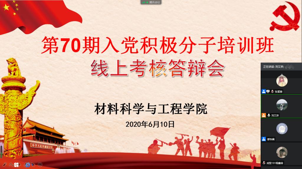 为进一步加强我院入党积极分子培养考察工作,扎实做好党员发展工作,检验第70期入党积极分子培养成效,6月10日下午,材料学院在线上举办第70期入党积极分子考核答辩会。