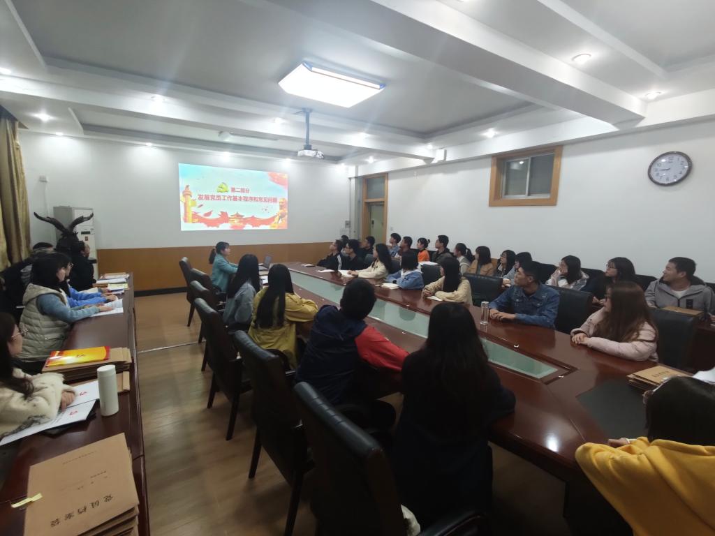 刘艾京老师以“党支部委员的工作职责”为题,对全体支部委员进行了党务工作培训,结合实际工作明确了各支部委员的分工和职责,并对学生支部规范开展“三会一课”和主题党日活动进行了指导。同时,她围绕“发展党员工作的基本程序和常见问题”,对党员发展的五个阶段和25个步骤进行了详细解读,指出了发展党员过程中的关键点和注意事项,对各阶段材料的准确、规范性进一步做了要求。她指出,学生党支部是党在高校的基层组织,肩负着宣传和贯彻党的路线、方针和政策的重要作用,承担着发展学生党员、开展大学生思想政治教育工作的重要职责,希望各党支部委员加强学习,提高工作水平,不断加强支部党员培养、教育和管理。