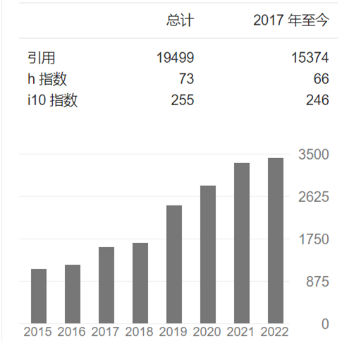 据Google Scholar数据显示,李喜飞教授累计发文350篇,被引用19499次,H因子73。引用次数呈上升趋势,2022年引用达到峰值3416次。