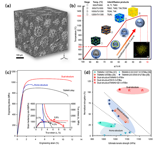 图1.基于互扩散─自组织策略制备的双结构Ti6Al4V-TiBw复合材料的微观形貌及其力学性能。(a)双结构Ti6Al4V-TiBw复合材料的显微形貌,(b)基于互扩散─自组织策略的双结构Ti6Al4V-TiBw复合材料组织演变过程,(c)双结构Ti6Al4V-TiBw复合材料及其对比材料的应力─应变曲线,插图为真应力─真应变曲线及其应变硬化率和真应变的关系曲线,(d)归一化伸长率与极限抗拉强度的Ashby图。