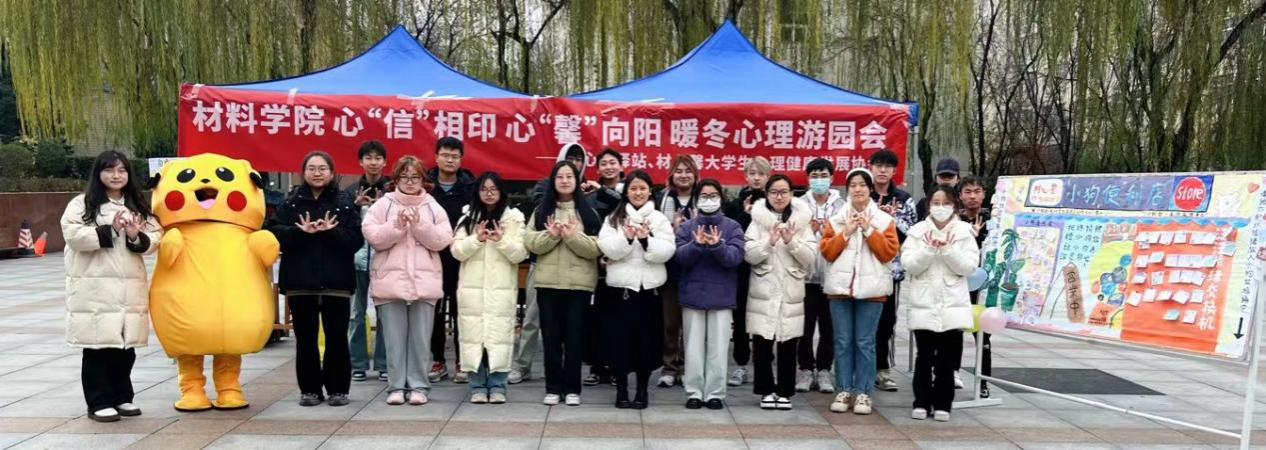 为做好大学生心理健康工作,提升大学生心理调适能力,缓解学生考试周前紧张焦虑情绪。由材料学院材心馨驿站主办,材心馨协会承办,院学生会协办的心“信”相印 心“馨”向阳暖冬心理游园会,于12月11-12日在曲江校区三餐广场开展。