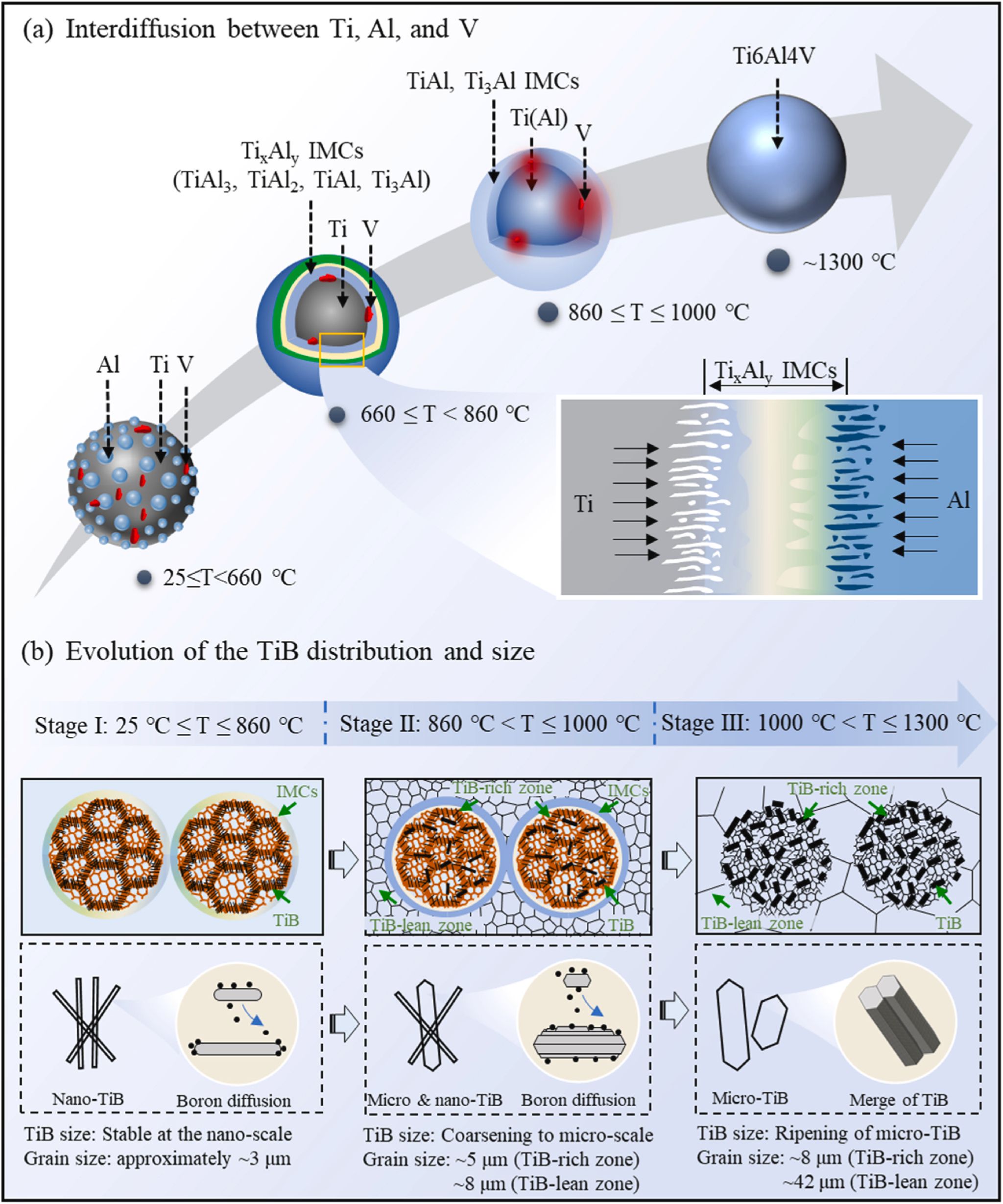 图1.三维球团状异质结构Ti64-TiB复合材料的形成过程示意图