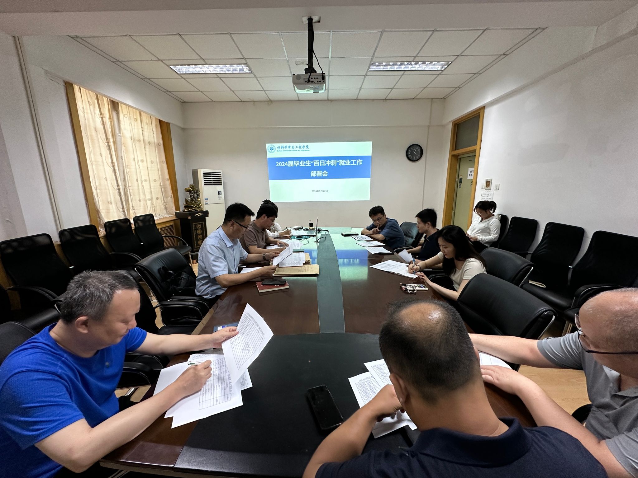 杨少博详细介绍了学校关于2024届毕业生就业“百日冲刺”的行动安排,通报了学院目前整体就业情况及5月10日就业推进会以来各班级导师、辅导员的工作举措,希望能加力加快持续推进就业工作进程,每周向各系、班级导师、研究生导师通报就业数据,每两周召开推进会议汇报工作进展,靠前发力、持续用力、形成合力,扎实做好就业工作。