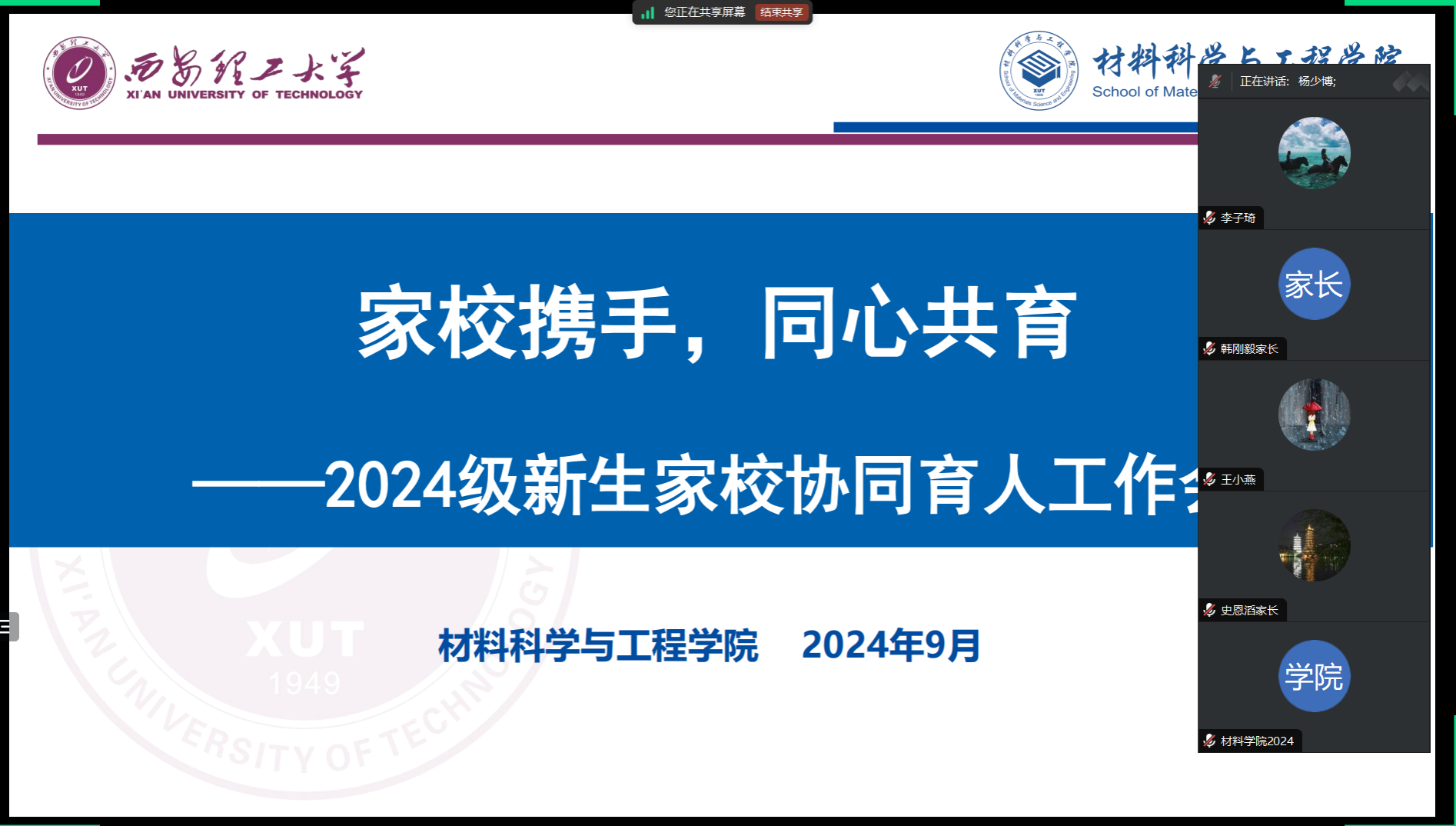 为切实增强家校沟通,构建协同育人长效机制,材料学院于9月11日召开2024级家校协同育人工作会,学院党委副书记兼副院长杨少博、2024级新生家长、2024级新生辅导员参加会议。