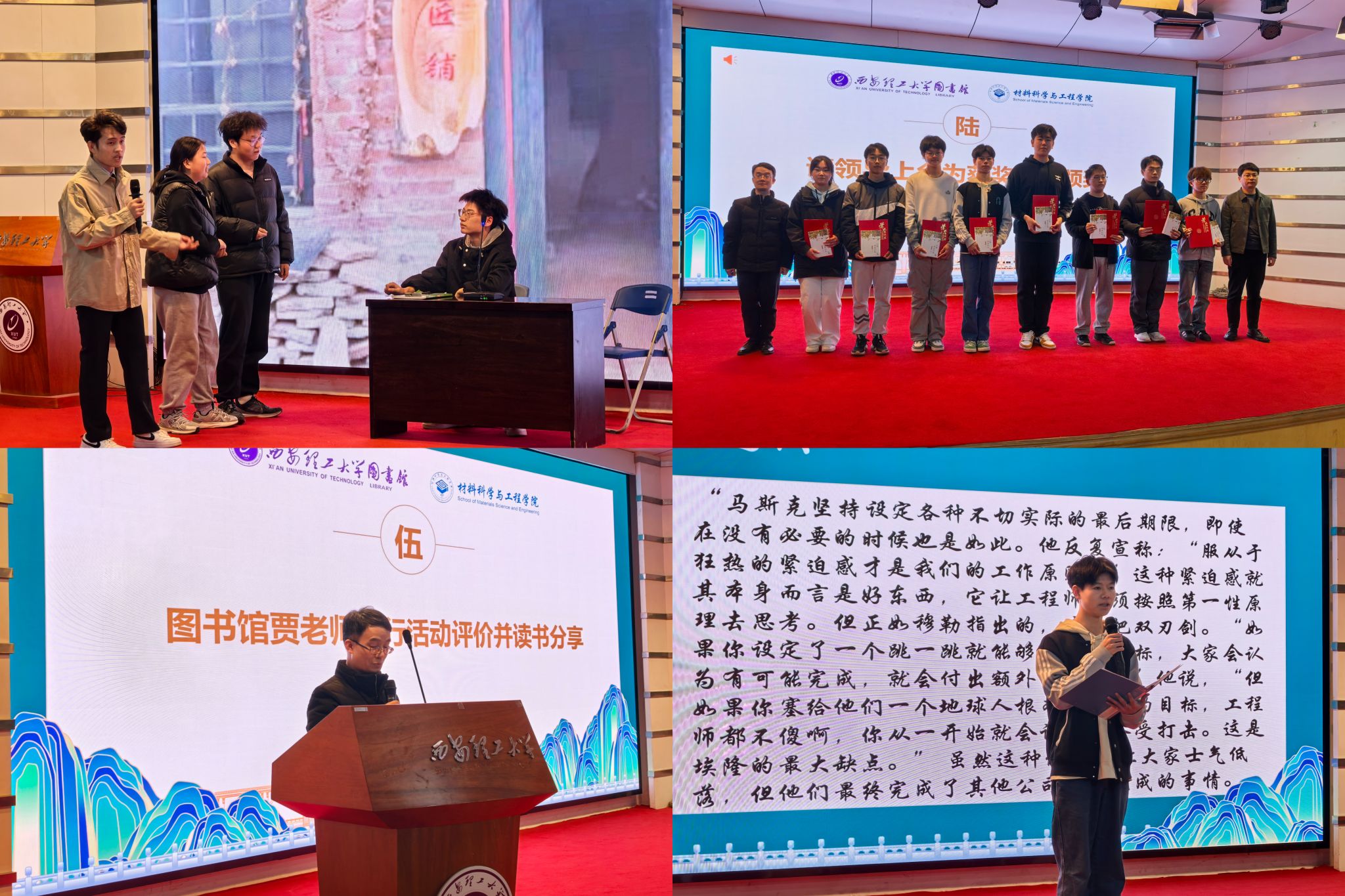 活动中,同学们通过话剧、演讲、情景剧、朗诵等多种表演形式向大家展现书籍片段,分享读书感悟。贾二鹏进行了活动评价与读书分享。各位老师为参与读书分享的同学们颁发了荣誉证书。