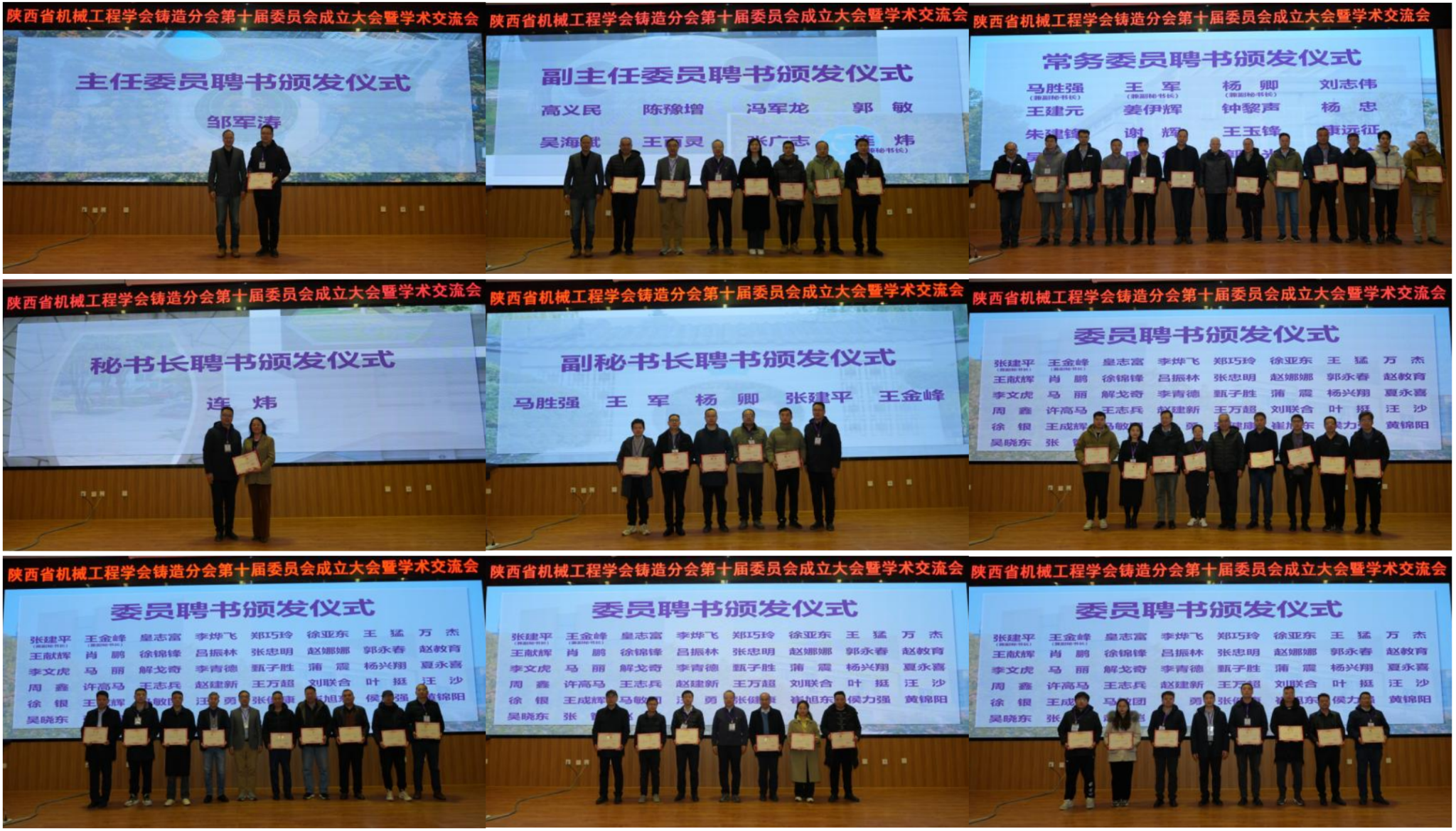 与会领导为全体委员颁发了聘书。陕西省机械工程学会秘书长景蔚萱为主任委员、副主任委员颁发聘书,监事长任国梁为常务委员颁发聘书。铸造分会主任委员邹军涛为秘书长、副秘书长颁发聘书,副主任委员高义民、陈豫增、冯军龙、吴海斌为委员颁发聘书。