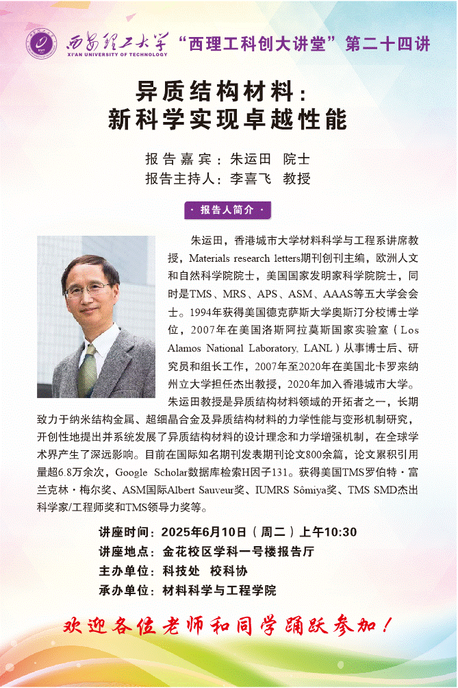 【淬砺成材】香港城市大学朱运田院士学术报告通知