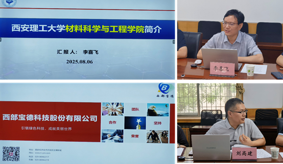 2025年8月6日,西部宝德科技股份有限公司党支部书记、董事长吴引江,副总经理南海娟,董事会秘书兼财务负责人杨团委,技术中心管理部部长刘高建,宝德九土总经理梁永仁等一行8人,来访材料科学与工程学院,就科研项目合作、科研平台建、人才培养等工作与我院教师展开深入交流。材料科学与工程学院党委书记邹军涛,材料科学与工程学院院长李喜飞,材料科学与工程学院副院长孙少东、杨卿,材料成型与控制系主任钟黎声,材料科学与工程系主任宫溢超,能源材料与器件系主任李文斌参加交流座谈。会议由孙少东副院长主持。