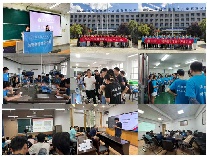 8月18日至29日实习第二阶段,实习队赴陕西华星电子开发有限公司进行为期十天的驻厂实习,本次实习涵盖工业生产的安全管理、陶瓷电容器、半导体化陶瓷电容器、微波器件、不同种类陶瓷电容器的工艺流程、设备操作技术要求、外观性能质量检测等多个方面。学生先后走进华星电子开发有限公司的瓷粉班、成型班、烧成班、被银班、成品班、半导体班和微波器件班等多个生产班组的车间现场,结合技术人员讲解和实际操作,直观了解了不同类型陶瓷电容器生产的每一道工序、工作流程及相关的技术要求。驻厂结束返校后,实习队还组织学生参观了自动化学院的太阳能电池板生产线,并由材料学院玄甲新材硕博党支部支部书记梁倩为同学们带来了“星光相伴,星火同行——把红色基因融入研究生的青春血脉”分享交流活动,加强了本次生产实习的党建引领作用。最后,带队老师对本次实习进行了答辩考核,并召开了师生总结座谈会,对本次实习的经验与不足进行了全面细致的梳理和总结。通过讲座分享、企业调研、动手实操、座谈交流、答辩总结等活动,学生对本专业相关的材料研发设计、制备工艺、分析测试、生产应用有了全面系统的认识。