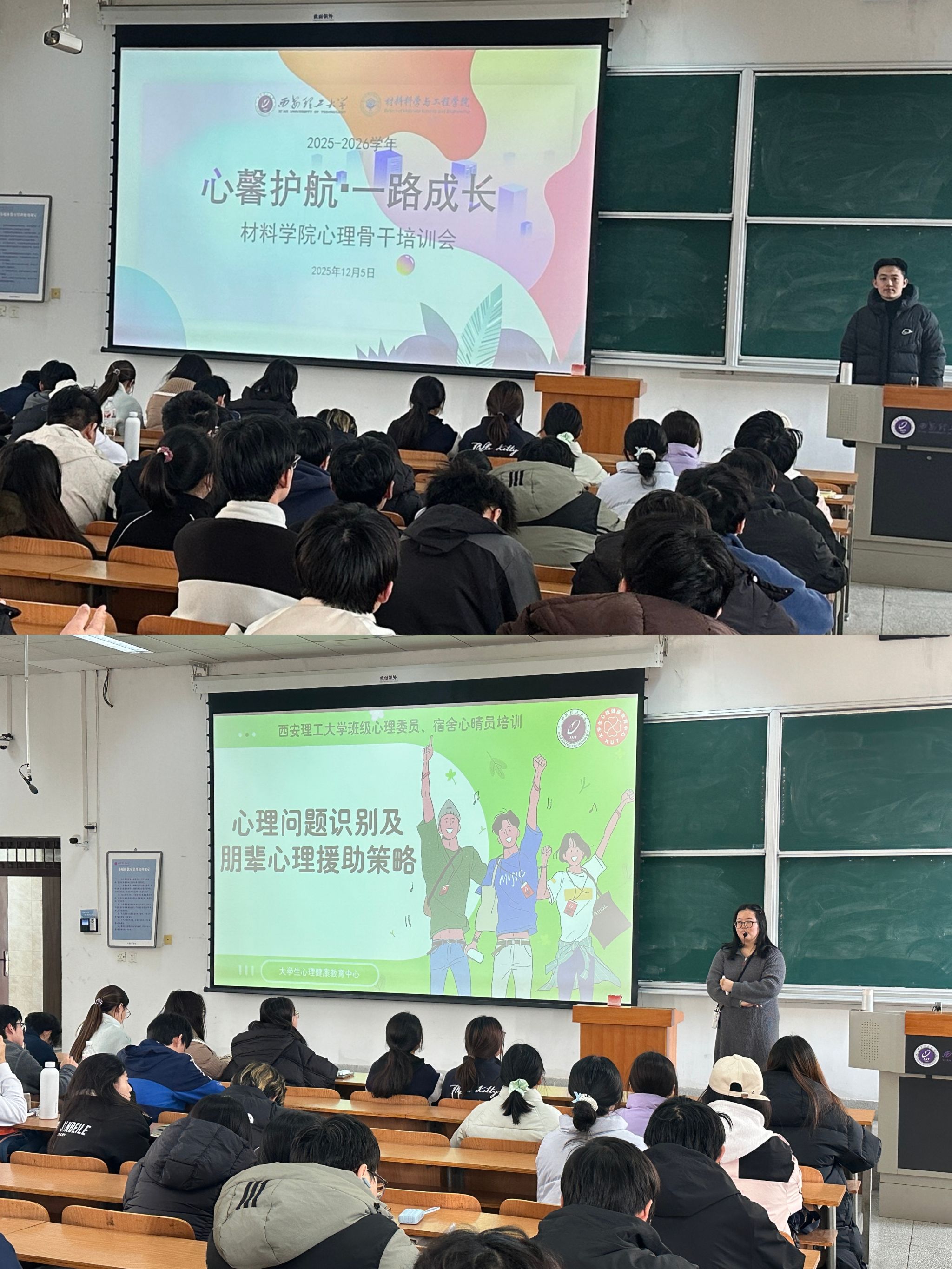 为培养学生积极向上的健康心态,提升学生心理骨干的心理异常识别能力与朋辈援助水平。12月5日下午,材料学院在曲江校区教十楼404开展2025-2026学年“心馨护航 一路成长”心理骨干培训会。2024、2025级全体心理委员及宿舍心晴员参与培训,大学生心理健康中心刘洋担任主讲。