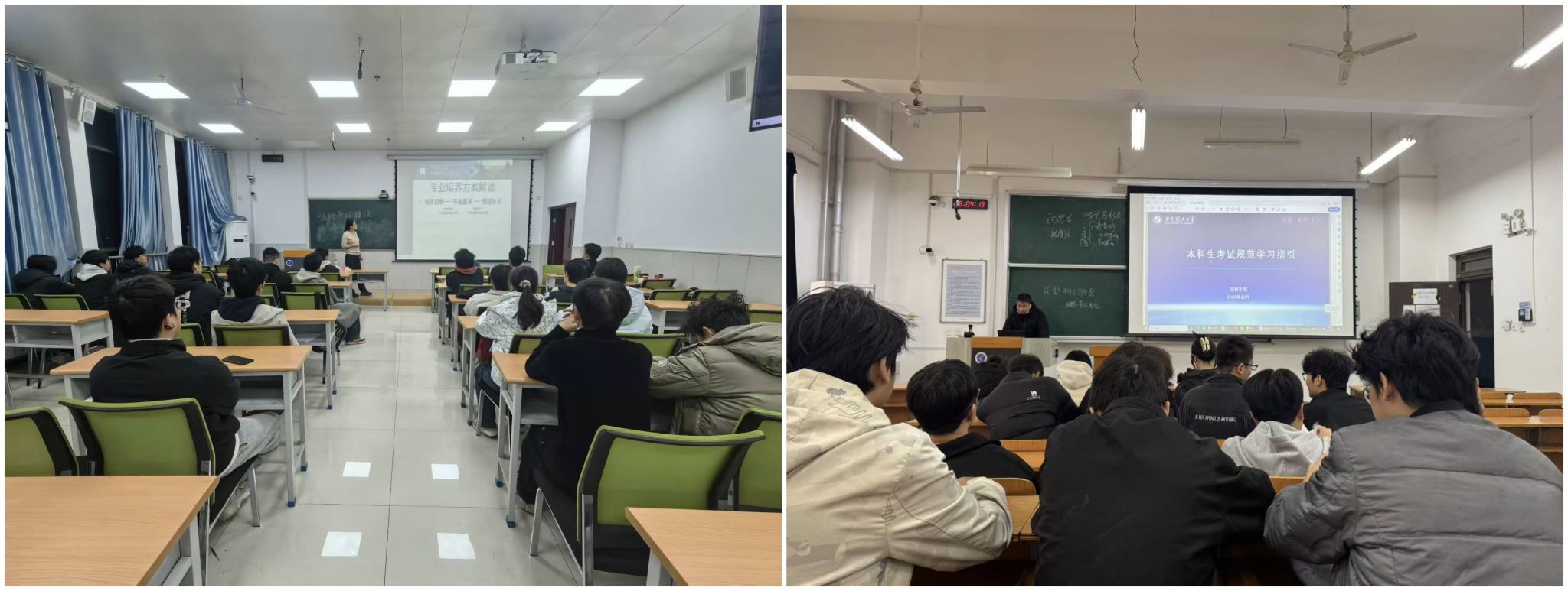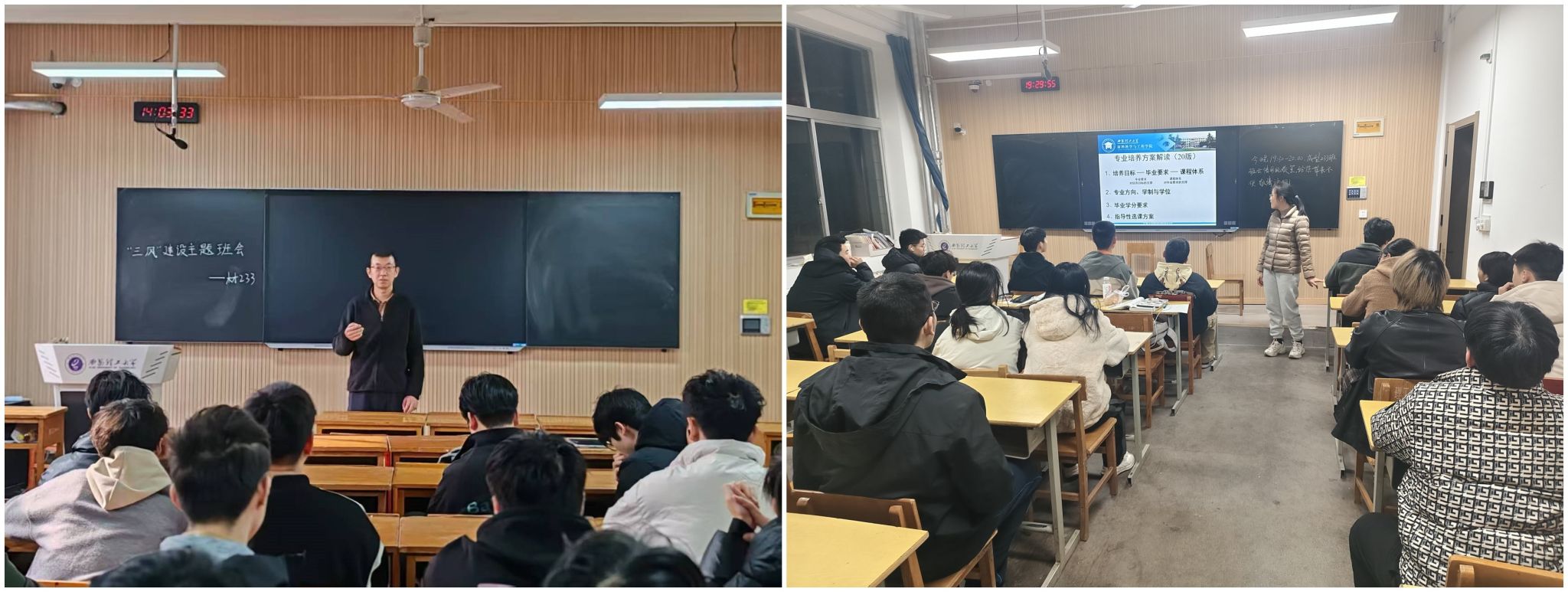 专题班会主要涉及学风建设、专业教育、考勤纪律三项内容。各班导师首先聚焦学风建设,着重强调学生的学习主体责任。导师们结合审核评估对人才培养质量的要求,鼓励学生树立自主学习、勤于思考的良好学风,主动参与课堂互动与课后实践,以扎实的专业素养和积极的学习态度迎接评估检验。专业教育是本次班会的重点环节。各班导师围绕专业培养方案,为学生详细解读课程体系、毕业要求、学科发展前景等内容,帮助学生明晰学习目标与发展方向,引导学生将个人成长与专业建设、学校发展紧密结合,增强学生的专业认同感与归属感。针对考勤纪律,各班导师重申学校课堂考勤管理规定,强调良好的考勤纪律是保障教学秩序、提升学习效率的重要基础。导师们结合实际案例,提醒学生严格遵守出勤要求,杜绝迟到、早退、旷课等现象,以良好的纪律意识助力迎评工作有序推进。