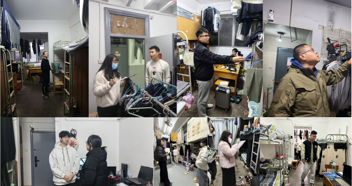 杨少博带队走访各年级宿舍,与辅导员一同重点排查消防安全、违规用电、物品存放等隐患。针对本地生短暂回家的特点,他强调:“宿舍安全管理不能松懈,在校学生要遵守宿舍作息规范,短暂回家的同学务必做好行程规划,确保往返安全。”同时,他要求辅导员精准掌握学生动态,对未在宿学生逐一核实去向,杜绝家长不知情的情况出现。