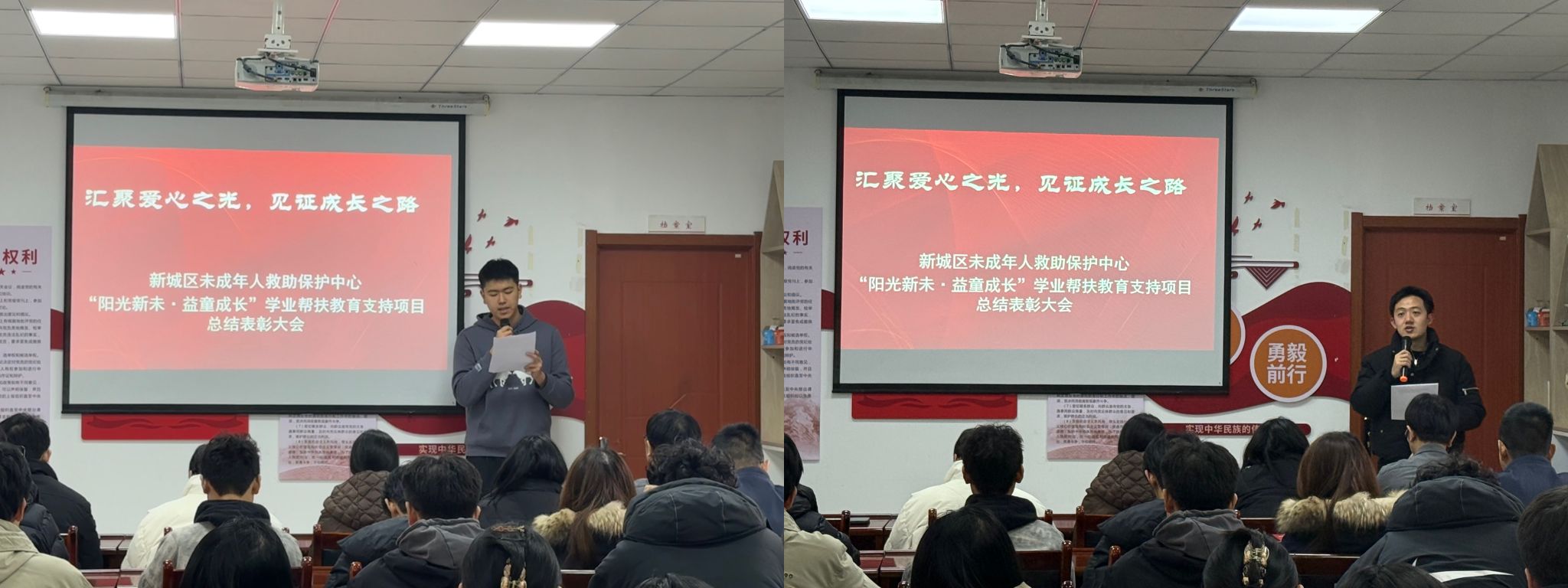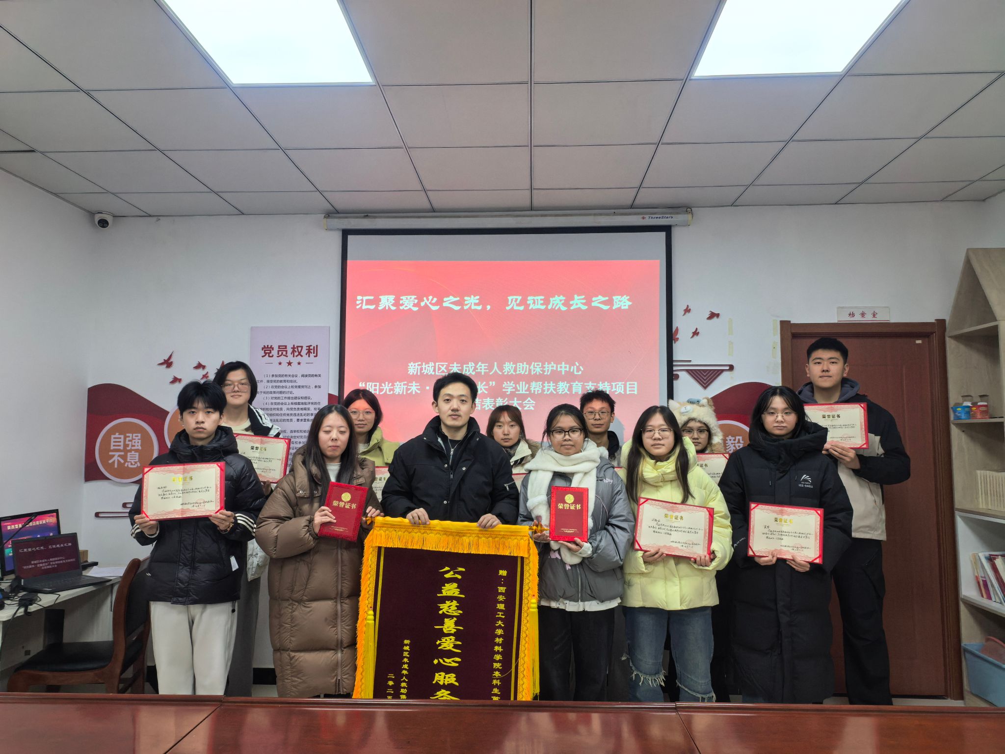 为深化实践育人成效,弘扬志愿服务精神,2026年1月3日下午15:00,新城区未成年人救助保护中心“阳光新未·益童成长”学业帮扶教育支持项目总结表彰大会圆满落幕。西安理工大学材料学院本科生第三党支部书记李子琦及11名材料学子参会。