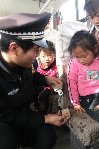 3月30日,山东省博兴县庞家派出所民警在教孩子们使用安全带。新华社发(孙国栋 摄)