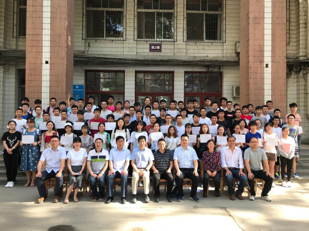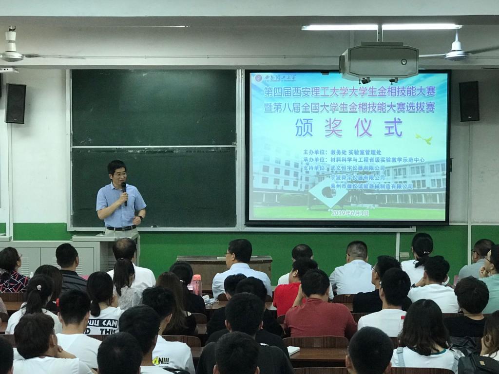 6月3日下午4点举行了大赛闭幕式。实验室管理处副处长胡明星、材料学院院长张国君,党委书记于长生,副院长汤玉斐,党委副书记、副院长郝敏敏,院长助理邹军涛,莱州市蔚仪试验器械制造有限公司经理刘刚,实验中心主任葛利玲,实验中心副主任王武孝,学工办负责人刘东出席闭幕式。会上葛利玲老师介绍了本次大赛赛况,随后,邹军涛老师宣布了获奖名单,与会领导为获奖同学代表进行了颁奖。最后,材料学院院长张国君宣布闭幕。