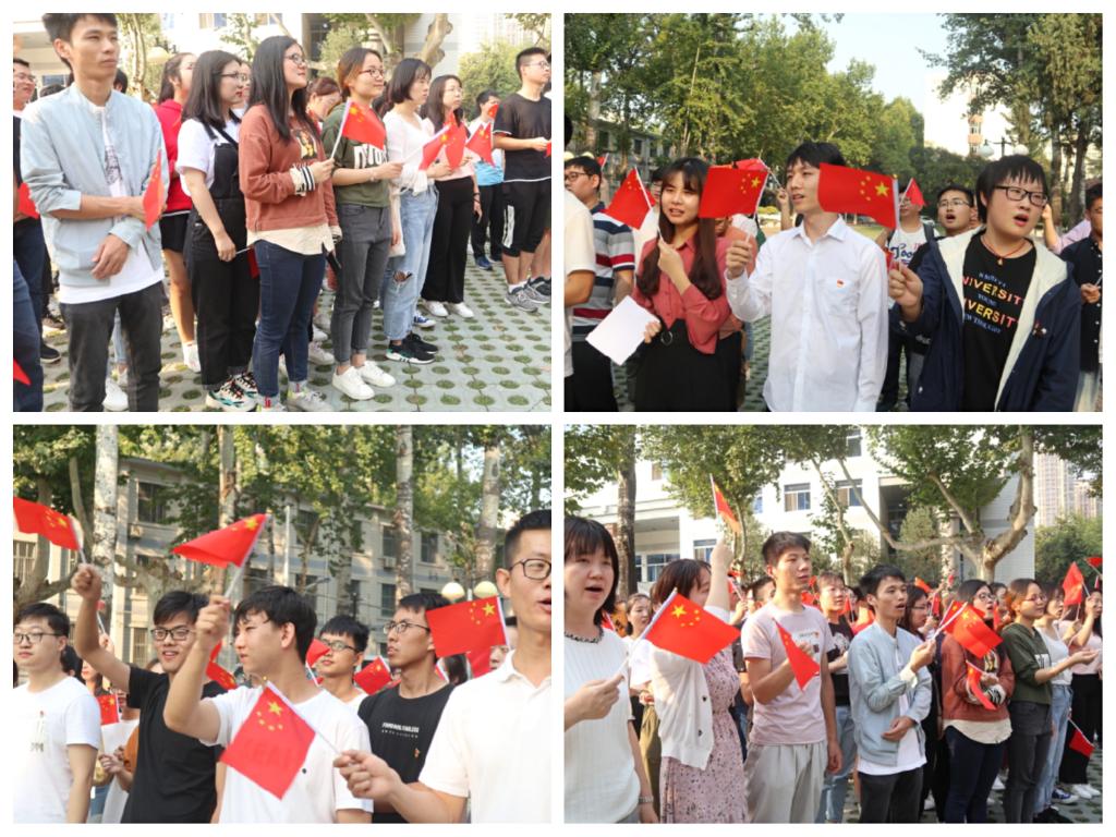 刘宝瑞同志首先以“我和我的祖国”为题进行了演讲,赞颂了新中国成立以来创造的一个又一个“中国奇迹”。红色政权来之不易,新中国来之不易,中国特色社会主义来之不易,只有坚持中国共产党的领导,我们才能让“幸福之花”遍布神州大地。随后,褚陆嘉、韦媛同志以“梦想照亮中国”为题,朗诵赞美了中华儿女锲而不舍追求梦想的伟大精神。麻一荻、杨琳娜同志以“祖国在我心中”进行了演讲,通过深情的话语回首七十载峥嵘岁月,表达了对祖国取得辉煌成就的自豪感。活动气氛在歌曲《我和我的祖国》中推向高潮,全体师生高举五星红旗合唱,用嘹亮的歌声为祖国庆生。