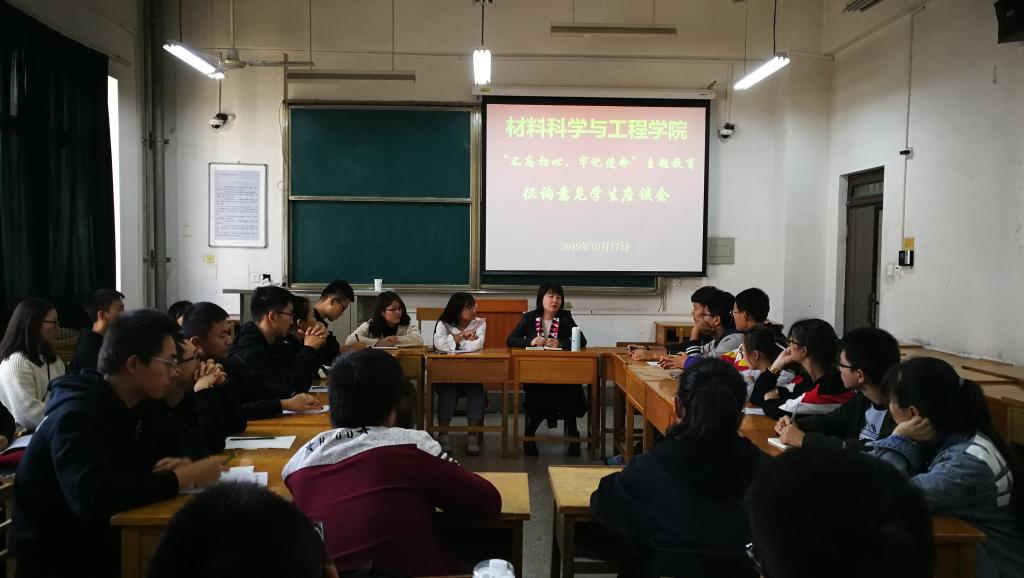 10月17日下午,材料学院在曲江校区10-415召开“不忘初心、牢记使命”主题教育学生座谈会。学院党委副书记、副院长郝敏敏、部分辅导员和一、二年级各专业学生代表30余人参加了座谈会。