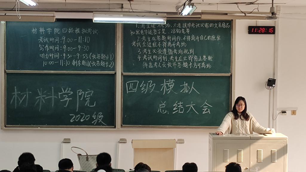 此次模拟考试,学院进行了周密的准备。模拟考试前,工作人员严格按照国家级英语四级考试规程,在黑板上书写考试时间与考场规则。考试期间,学生们专心致志,认真审题,严谨作答,严格按照考试时间合理分配答题时间。考试结束后,辅导员张紫萱、刘东结合巡考过程中发现的问题,从考前文具准备、考试时间分配、考试技巧等方面进行了总结。
