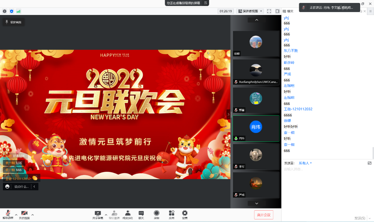 为丰富疫情期间研究生学习生活,减轻学生隔离期间的心理压力,1月1日晚,材料学院新能源师生党支部联合先进电化学能源研究院通过腾讯会议举办了元旦联欢会,晚会特邀外籍院士、先进电化学能源研究院院长孙学良,材料学院副院长、先进电化学能源研究院执行院长李喜飞参加,党支部全体党员及研究院全体师生云端相聚,线上参加了元旦联欢会,联欢会由党支部书记李文斌主持。