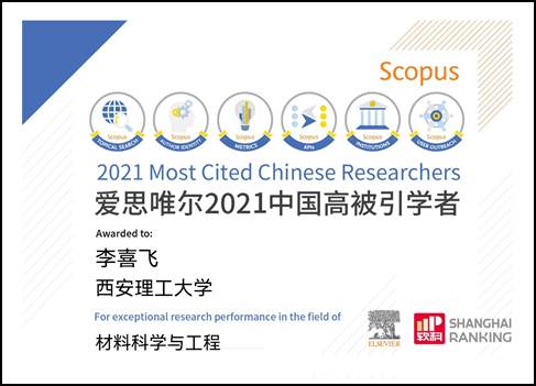 李喜飞教授已在Sci. Adv.、Nat. Commun.、Adv. Mater.、Joule、Energy Environ. Sci.等期刊发表320余篇学术论文,SCI引用17000余次,H因子68,55篇论文被评为ESI 1%高被引论文,已连续四年(2018-2021年)入选科睿唯安全球“高被引科学家”(陕西省属高校唯一入选者)。