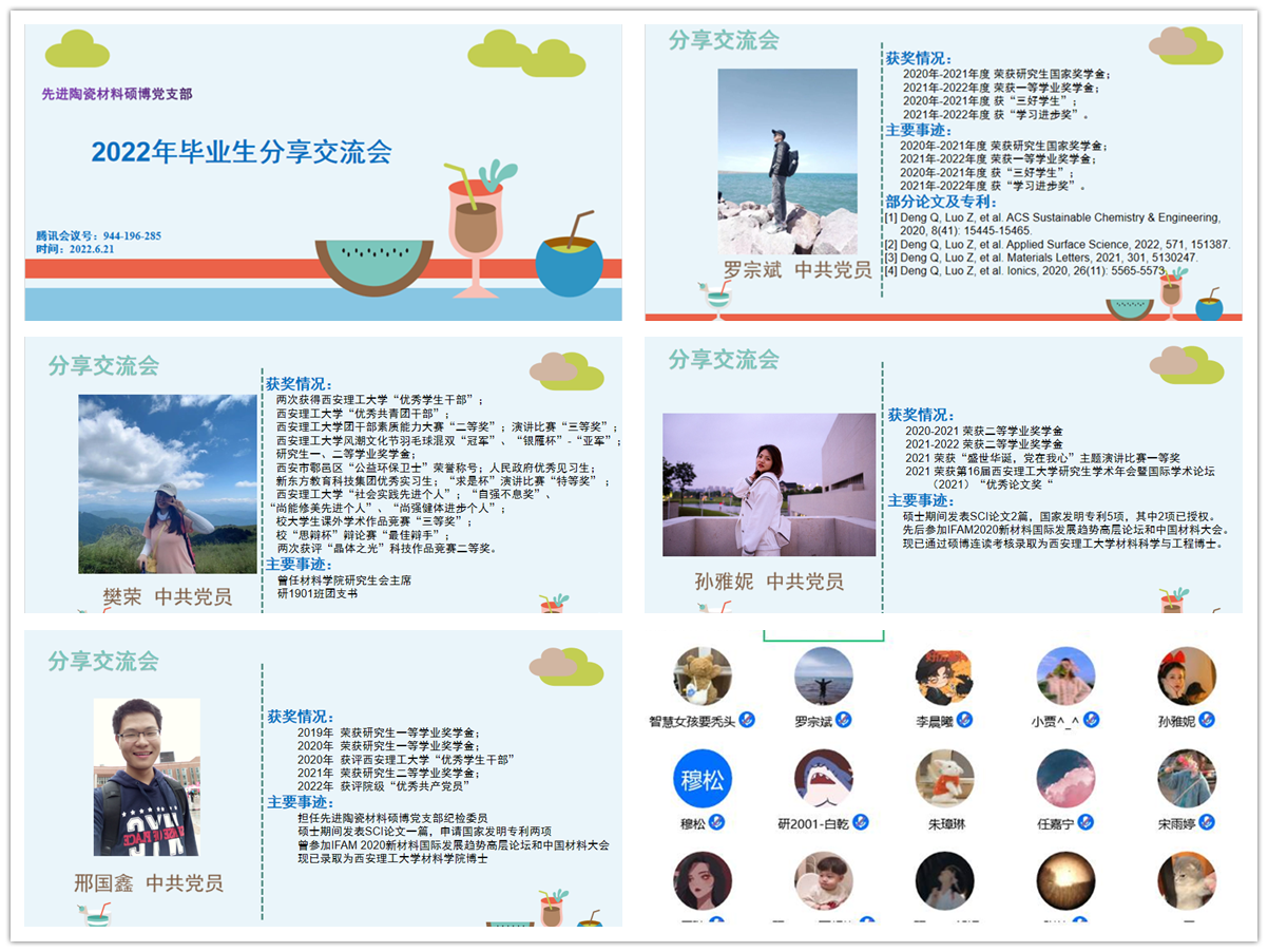 2022年6月21日晚,先进陶瓷材料硕博党支部组织开展了第六期“科研相伴、协伴而行”交流分享会,由支部四位毕业生党员面向全院研究生及部分继续读研深造的本科生进行经验分享。