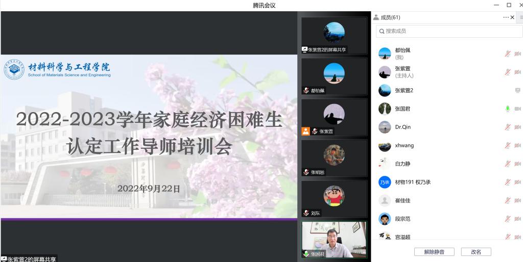 为做好2022-2023学年家庭经济困难生认定工作,进一步提升学院资助精准度,材料学院于9月22日下午四点半在线上召开家庭经济困难生认定工作导师培训会。学院院长张国君,全体本科生导师、辅导员参会,会议由学工办主任刘东主持。
