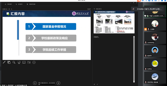 为切实做好2023年国家自然科学基金申报工作,10月24日上午,材料科学与工程学院召开第二场国家自然科学基金工作会(线上)。学院副院长李喜飞、各系/中心主任、教师代表等30余人参加此次工作会。李喜飞副院长主持此次会议。