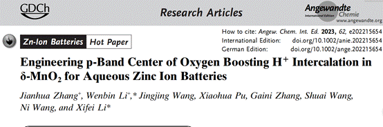 近日,西安理工大学材料学院李喜飞教授高性能电池材料团队在水系锌离子电池锰基正极材料方面取得重要研究成果,研究论文“Engineering p-Band Center of Oxygen Boosting H+Intercalation in δ-MnO2for Aqueous Zinc Ion Batteries”在线发表于《Angewandte Chemie International Edition》(影响因子:16.6),并被选为热点论文(Hot Paper)。《Angewandte Chemie International Edition》是国际化学领域顶级学术期刊。西安理工大学为该研究论文的唯一署名单位,材料学院硕士研究生张健华为论文第一作者,李喜飞教授和李文斌副教授为论文的共同通讯作者。该工作获得了国家重点研发计划、国家自然科学基金、陕西省重点科技创新团队和陕西省杰青等项目的支持。
