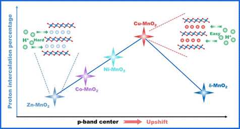 本文创新性地采用层间工程策略,通过在δ-MnO2层间预嵌Zn2+、Co2+、Ni2+、Cu2+或Mg2+(M-MnO2),调控了δ-MnO2中O的p带结构,实现了H+插层贡献的调制。发现调节金属-氧键类型和共价度可改变氧原子的平均电荷,优化M-MnO2的εp(p带中心)和H+吸附能,促进H+吸附和解吸之间的平衡,提升H+插层贡献。率先揭示了δ-MnO2正极中,O的εp与H+插层占比呈现火山曲线关系,阐明了εp可以作为H+插层的一个重要描述符。最后,制备的Cu-MnO2正极在3 A g-1的高倍率下经过1000次循环后,仍能提供153 mAh g-1的容量。该项工作为理解与利用H+插层调制δ-MnO2正极电化学性能提供了深入的认识,为其他锌离子电池正极材料电化学性能的增强提供了重要参考。