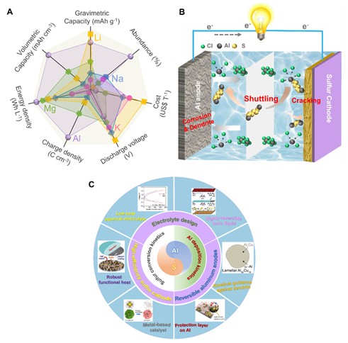铝硫(Al-S)电池由于其高体积能量密度、高安全性、低成本以及Al和S元素的高丰度而被认为是可以满足日益增长储能需求的替代品(图1A)。然而,铝硫电池仍存在许多挑战,如多硫化物转化动力学缓慢、电解液兼容性差和潜在的铝腐蚀和枝晶形成等问题(图1B)。当前大多数研究都集中在设计或开发合适的基体材料或优化兼容的电解质上,以寻求高性能的Al-S体系。然而,目前对Al-S电池的研究现状及进一步发展仍然缺乏系统而深入的总结和分析。基于此,本文系统综述了抑制多硫化物的穿梭以及平滑铝负极溶解/沉积的具体策略。重点阐述了硫正极从吸附到促进多硫化物转化动力学的催化调控的发展;电解质从简单的组分调控到降低离子传输势垒的演变;铝负极保护结合离子传输调控策略实现无枝晶铝负极(图1C),更清晰地解读了Al-S电池可能的电化学反应机制及该体系中高活性催化剂潜在的工作机制。最后,进一步展望了实现高性能Al-S电池的方法及大规模储能应用面临的机遇和挑战,对发展高能量密度快速充放Al-S电池体系具有重要的启示作用。