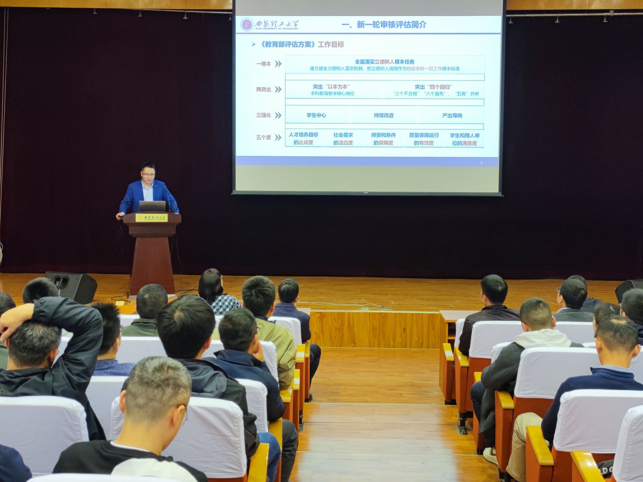 邹军涛解读了《陕西省普通高等学校本科教育教学审核评估实施方案》,详细说明了审核评估的主要内容和各项指标点,强调了学校对审核评估各项工作的要求,布置了学院今后一段时间的主要任务及安排。他指出,新一轮审核评估落实党和国家深化新时代教育评价改革的重要举措,是加快构建中国特色高等教育质量保障体系的重要途径。全体教职员工要以高度的责任感和使命感,严格按照学校学院的要求,做好本次诊断评估工作。