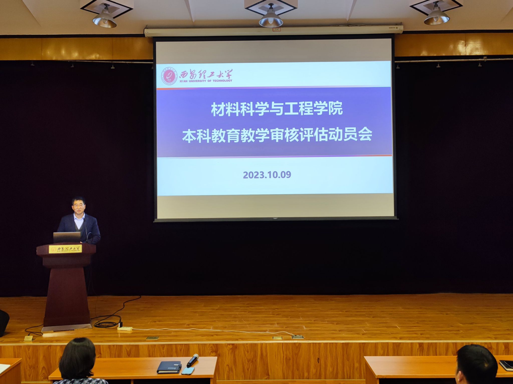 为迎接教育部本科教育教学审核评估工作,材料科学与工程学院于10月9日下午在金花校区图书馆报告厅举行动员会。学院党委书记陈梅、院长张国君、党委副书记杨少博、副院长邹军涛、汤玉斐、李喜飞及全体教职工参加了会议。