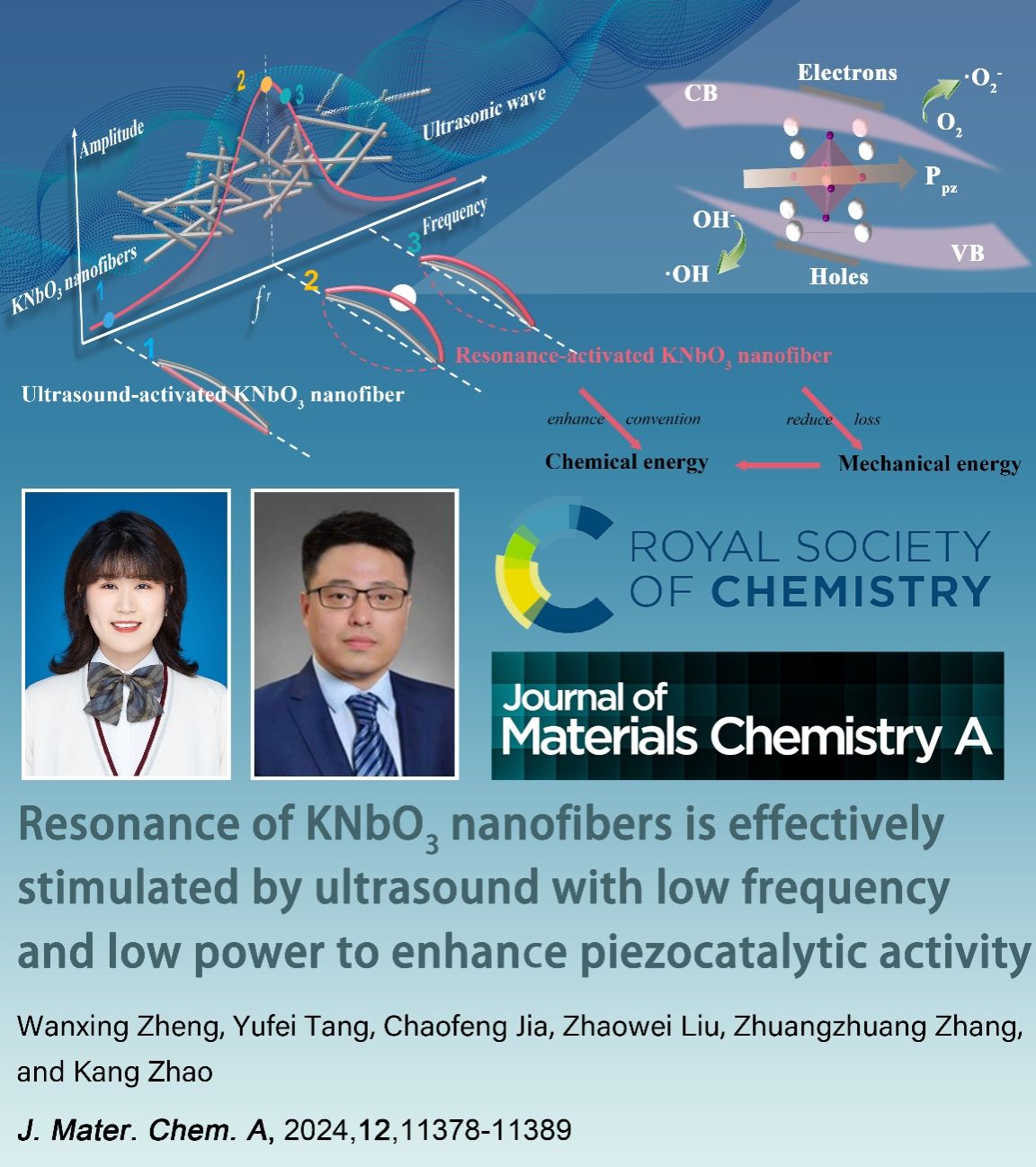 近日,我校材料科学与工程学院汤玉斐教授团队提出了在压电催化剂的共振频率处激发变形以提高其变形量,研究了共振效应对压电催化活性的促进作用。该研究为低能量超声激活压电催化实现高效降解提供了一条新的途径,有望作为曝气滤池中填料使用,以实现无需新增设备,在单位时间内快速深度降解废水的目标,具有实际意义。相关成果以题为“Resonance of KNbO3nanofibers is effectively stimulated by ultrasound with low frequency and low power to enhance piezocatalytic activity.”发表在英国皇家化学会期刊Journal of Materials Chemistry A上(IF=11.9)。论文第一作者为西安理工大学博士生郑婉星,通讯作者为西安理工大学汤玉斐教授。