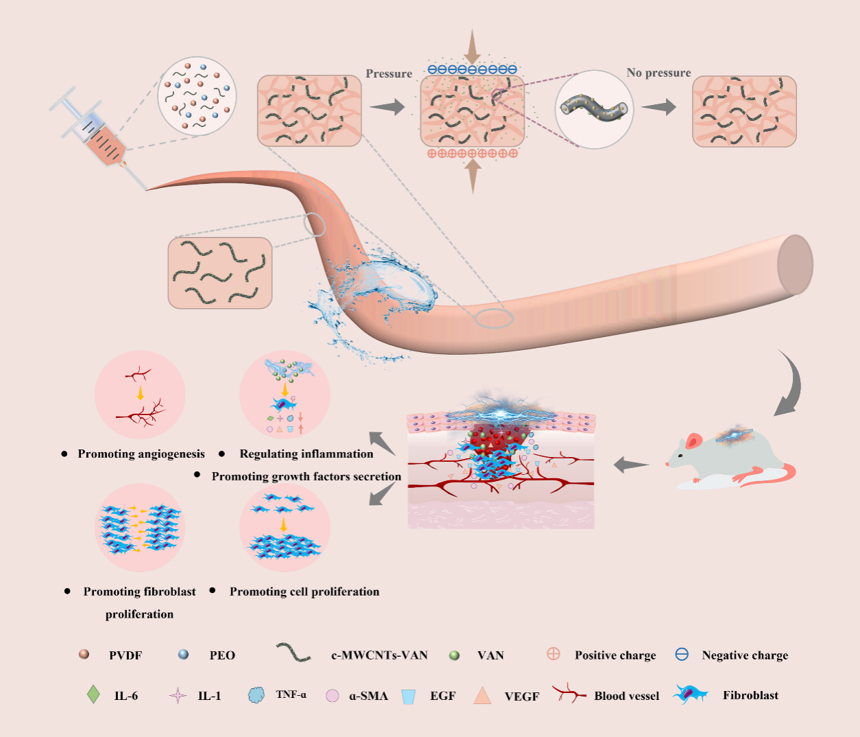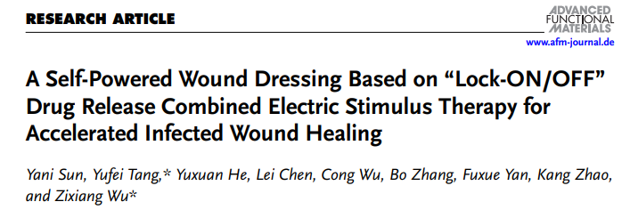 近日,西安理工大学材料学院汤玉斐教授肢体创伤修复材料创新团队博士生孙雅妮在基于“Lock-ON/OFF”电场(EF)驱动药物释放联合电刺激(ES)治疗PCVE自供电伤口敷料用于加速感染性创面修复方面取得重要研究成果。研究论文以A Self-Powered Wound Dressing Based on “Lock-ON/OFF” Drug Release Combined Electric Stimulus Therapy for Accelerated Infected Wound Healing为题在线发表于材料领域国际知名学术期刊《Advanced Functional Materials》(IF:19.0,1区TOP)。西安理工大学为该研究论文的第一署名单位,材料学院博士研究生孙雅妮为论文第一作者,西安理工大学汤玉斐教授、空军军医大学西京医院吴子祥教授为论文共同通讯作者。该工作得到国家自然科学基金和陕西省自然科学基础研究计划的资助与支持。