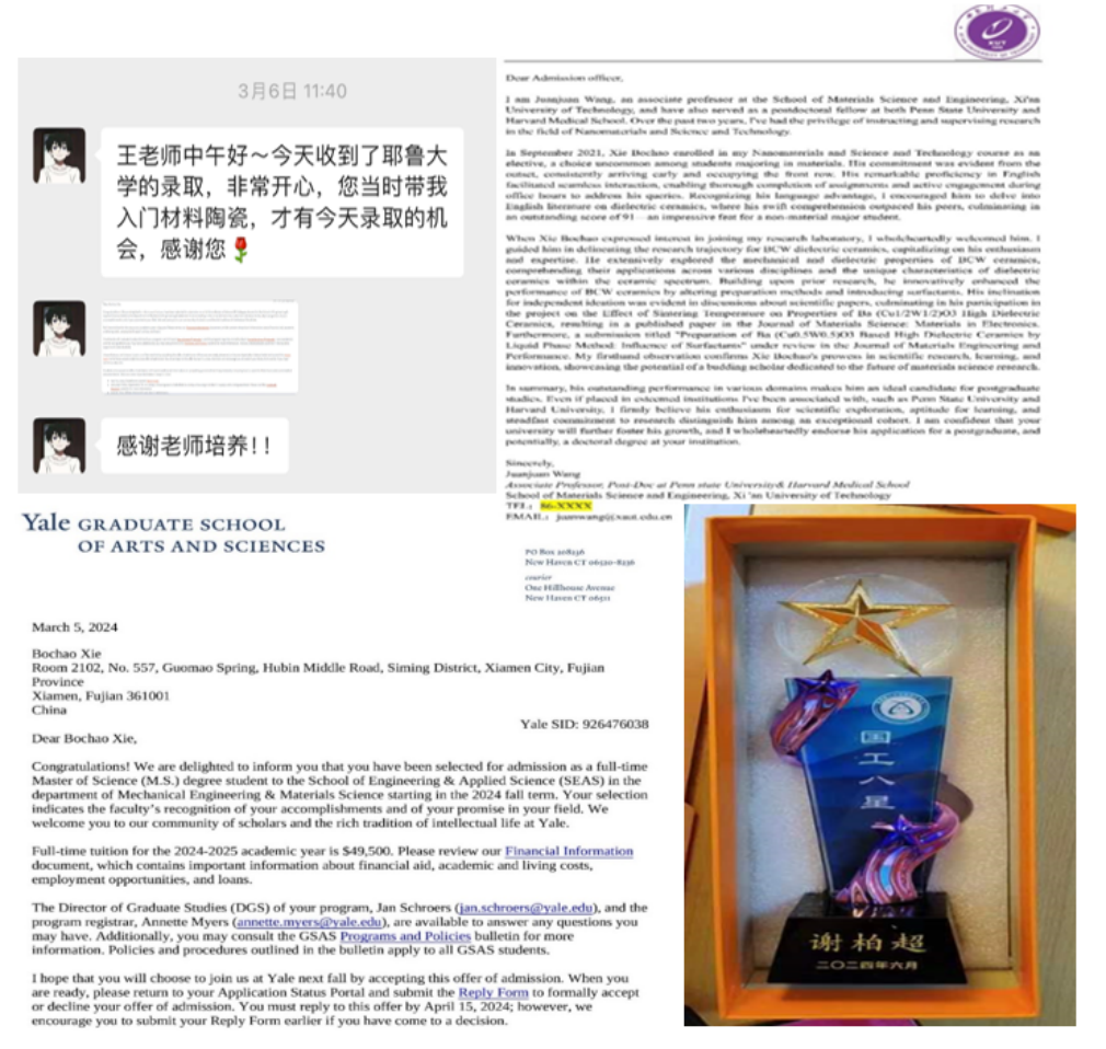 2022年春季学期,国际工学院2020级土木工程专业本科生谢柏超选修了王娟娟老师的《纳米科学与技术》双语课程。在这门课程中,他深受“材料精神”的启发,决定加入王娟娟老师的课题组,并表达了对出国深造的强烈愿望。对此,王娟娟老师积极回应,为谢柏超提供了科研和论文方面的悉心指导,助力他成功发表了题名“Effect of sintering temperature on properties of Ba (Cu1/2W1/2)O3 high dielectric ceramics.”和“Preparation of Ba(Cu0.5W0.5)O3 based high dielectric ceramics: Influence of surfactants”等两篇材料陶瓷相关的SCI论文。除了科研指导,王娟娟老师还在选校、雅思考试准备以及申请流程等方面为谢柏超提供了细致的帮助和建议。在王娟娟老师的精心指导下,谢柏超凭借其在本科阶段发表的SCI论文和出色的学业成绩,最终成功获得耶鲁大学的青睐。
