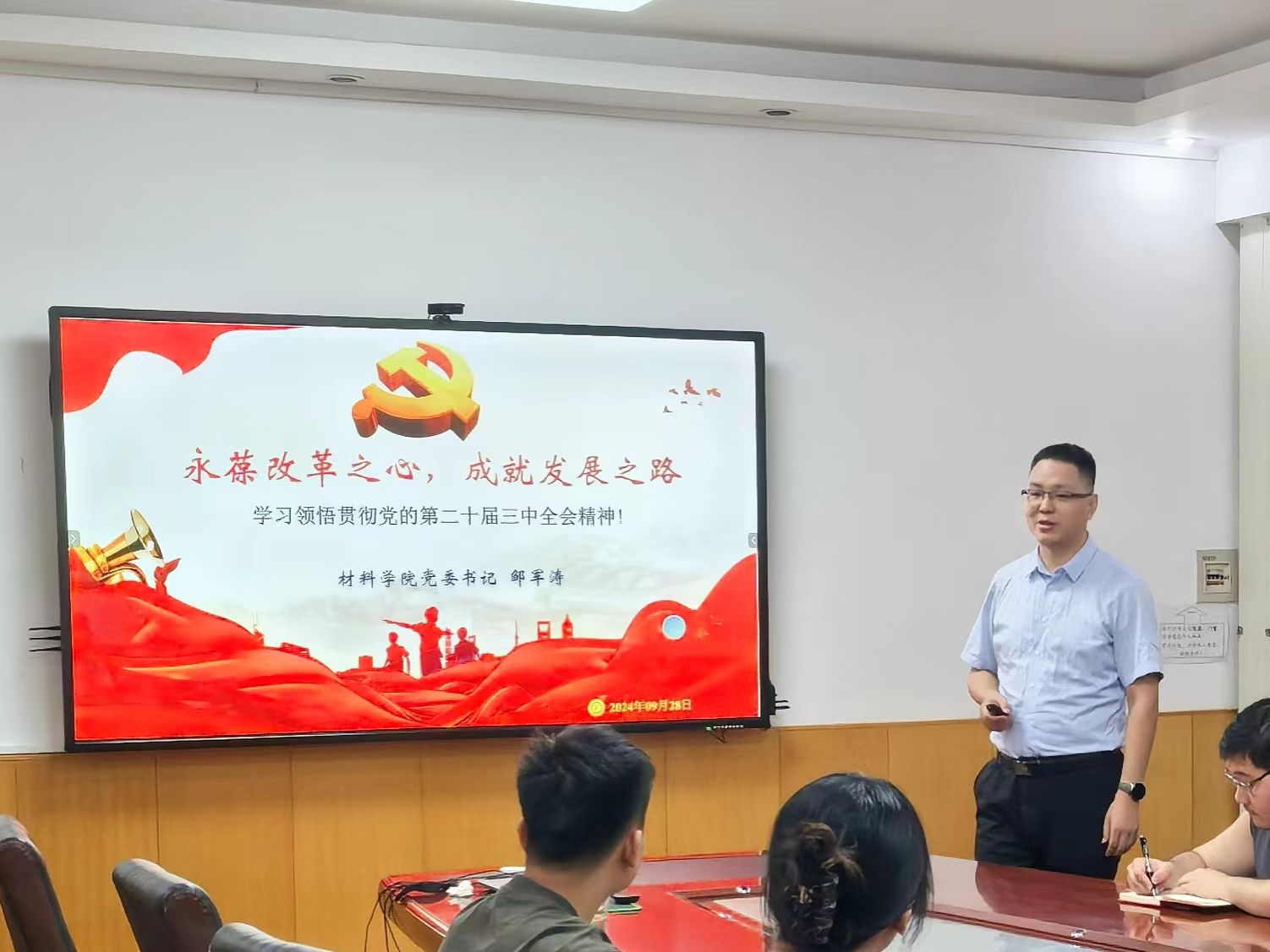 为庆祝中华人民共和国成立75周年,深入学习宣传贯彻党的二十届三中全会精神,9月28日上午,电工材料硕博党支部邀请学院党委书记、支部指导教师邹军涛教授在学院会议室为支部全体党员及入党积极分子讲授专题党课。
