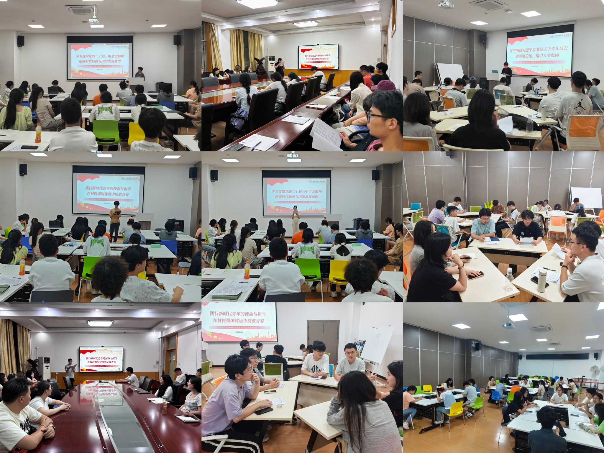 研讨以“集中学习—小组分享—集体讨论—小组汇报”的形式展开,确保人人参与、充分交流。研讨聚焦三个核心主题:(一)学习贯彻党的二十届三中全会精神,深刻把握时代脉搏与国家发展宏伟蓝图;(二)深学细悟习近平总书记关于青年成长成才的重要论述,明确人生航向与价值追求;(三)践行新时代青年的使命与担当,如何在材料强国建设中贡献青春力量。