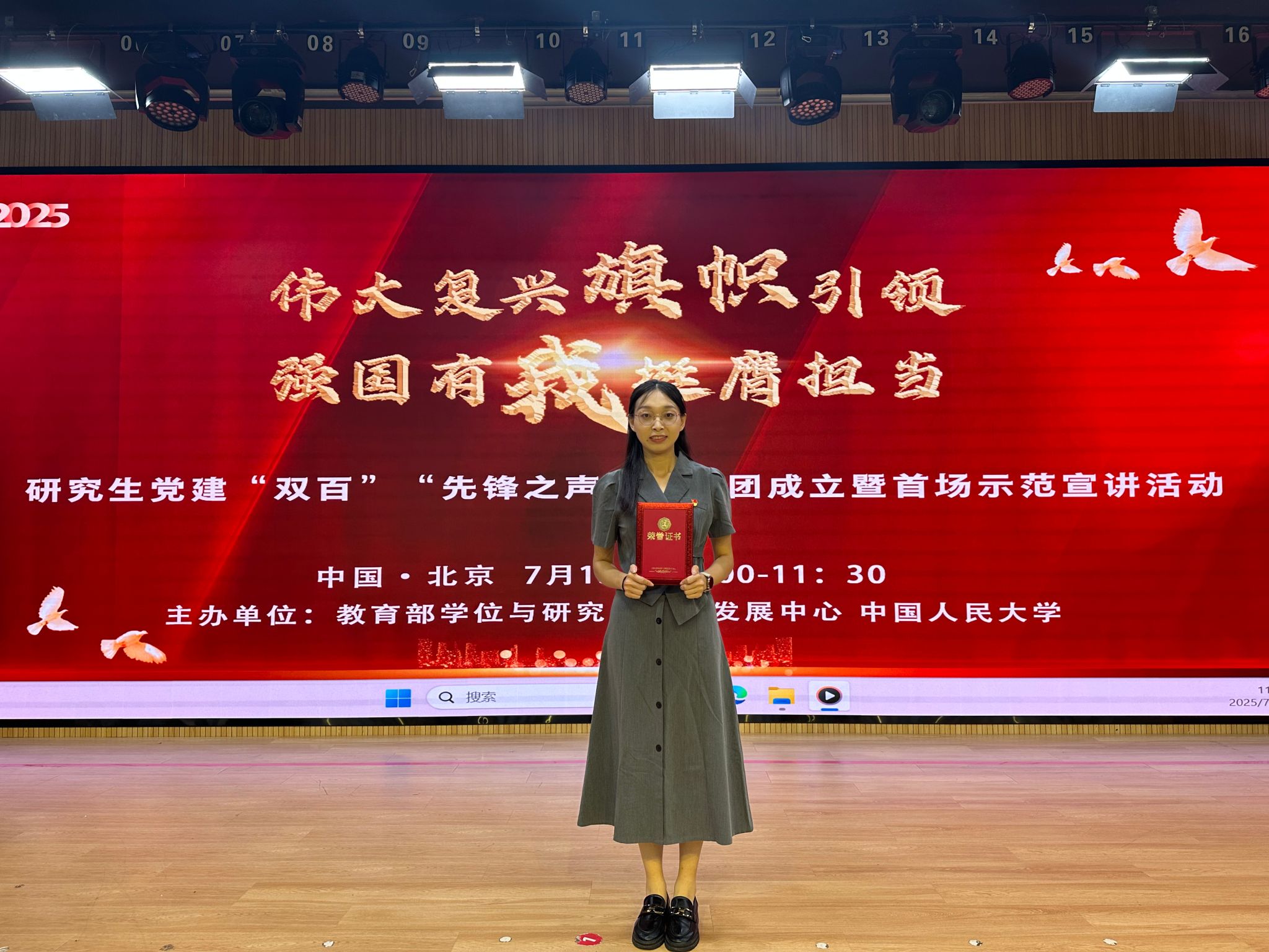 7月15日,由教育部学位与研究生教育发展中心联合中国人民大学举办的研究生党建“双百”“先锋之声”宣讲团成立暨首场示范宣讲活动顺利开展。本次活动以“伟大复兴旗帜引领,强国有我挺膺担当”为主题,采用线下与线上相结合的方式进行,线下会场设在中国人民大学中关村校区,线上则通过网络直播的形式呈现。第三批“全国百名研究生党员标兵”、我院研究生梁倩入选了研究生党建“双百”“先锋之声”宣讲团并受邀参加首场示范宣讲活动。