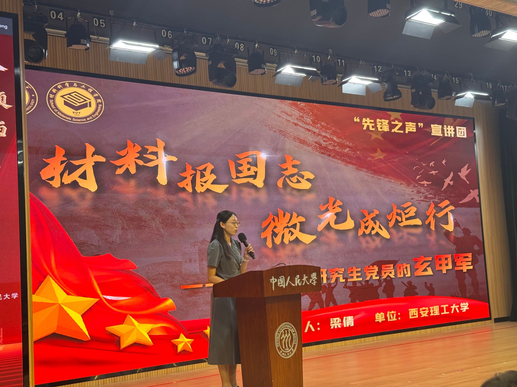 梁倩以《材料报国志,微光成炬行:做新时代研究生党员的“玄甲军”》为题展开宣讲,紧扣“传承、奋斗、梦想”主线,生动展现了老一辈西理工人“听党指挥,科技报国”的热血情怀。她通过讲述在学院发展历程中涌现出的一代代深耕奉献者的事迹,展现了材料领域科研工作者们将“微光”汇聚成科技自立火炬的奋斗历程。同时,她结合自身团队的科研实践,介绍了团队在破解“以铝节铜”卡脖子难题、首创“四位一体”研究生党支部工作新模式等方面的成果,阐述了新时代研究生党员以创新之火淬炼科研“玄甲”,践行“听党指挥、先锋模范、卓有成效”的使命担当。