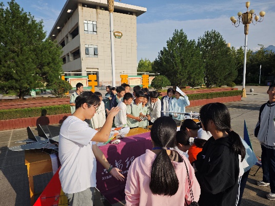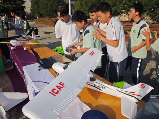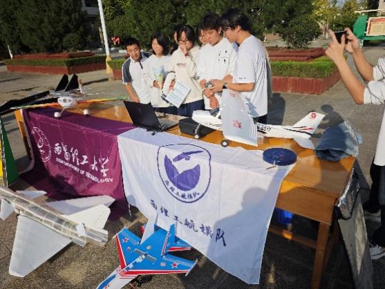 西安理工大学航模队的同学们为西安惠安中学的师生们带来了多个飞机模型,并进行了精彩的展示和详细讲解。在航模队同学的指导下,西安惠安中学的同学们还亲自操作了飞机模型,感受到了科技的魅力与乐趣。
