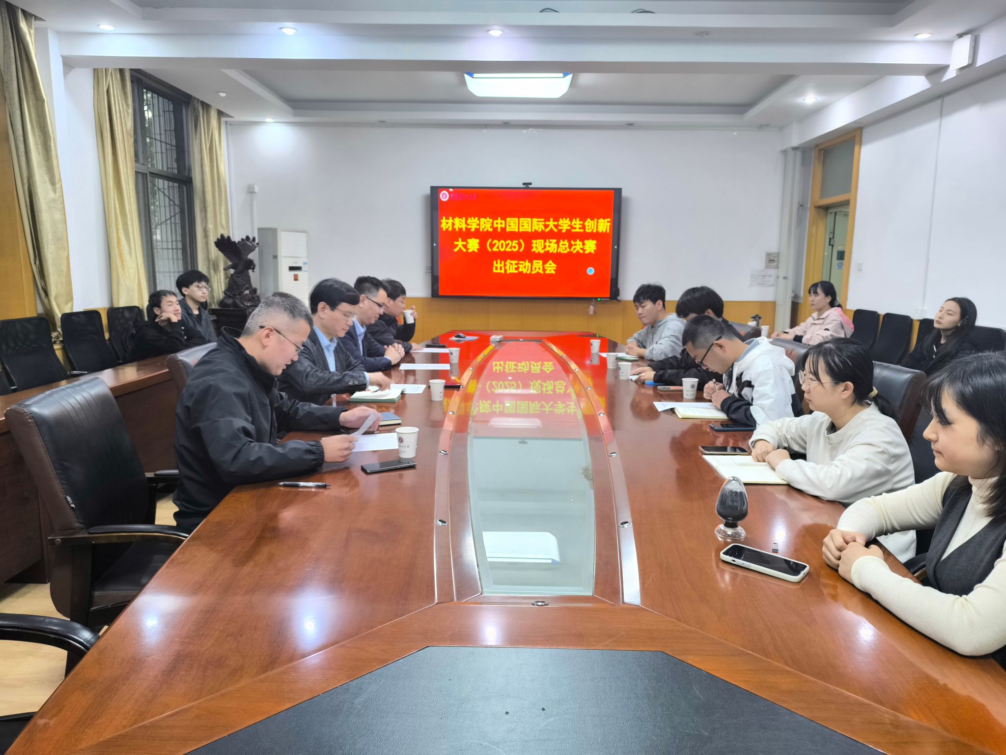 10月10日,材料科学与工程学院在教二楼学院会议室举行中国国际大学生创新大赛(2025)现场总决赛出征动员会,材料学院党委书记邹军涛、院长李喜飞、党委副书记杨少博、副院长李福平,入围国赛现场答辩的项目团队师生代表参加会议。会议由李福平副院长主持。