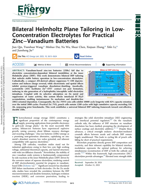 近日,我校材料科学与工程学院高性能电池材料团队李喜飞教授、秦戬副教授等在能源材料领域顶级期刊《ACS Energy Letters》(SCI,影响因子为18.2)上发表重要研究成果,论文题为:“Bilateral Helmholtz Plane Tailoring in Low-Concentration Electrolytes for Practical Zinc–Vanadium Batteries”(面向实用化锌钒电池的低浓度电解质双边亥姆霍兹面调控策略)。该成果由西安理工大学联合苏州大学、西北工业大学合作完成,西安理工大学为第一作者单位,材料科学与工程学院秦戬副教授为论文第一作者。